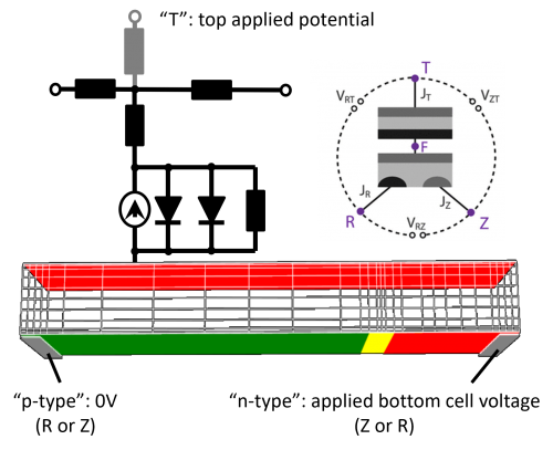This examples shows how to setup a 3T tandem device using the simplified 'IBC' syntax. It simulates the bottom- and top-cell JV curves for different voltage-match ratios. The JV-curves are not entirely independent in a 3T device due to photon-coupling and sharing a common electron transport path through the bottom cell.